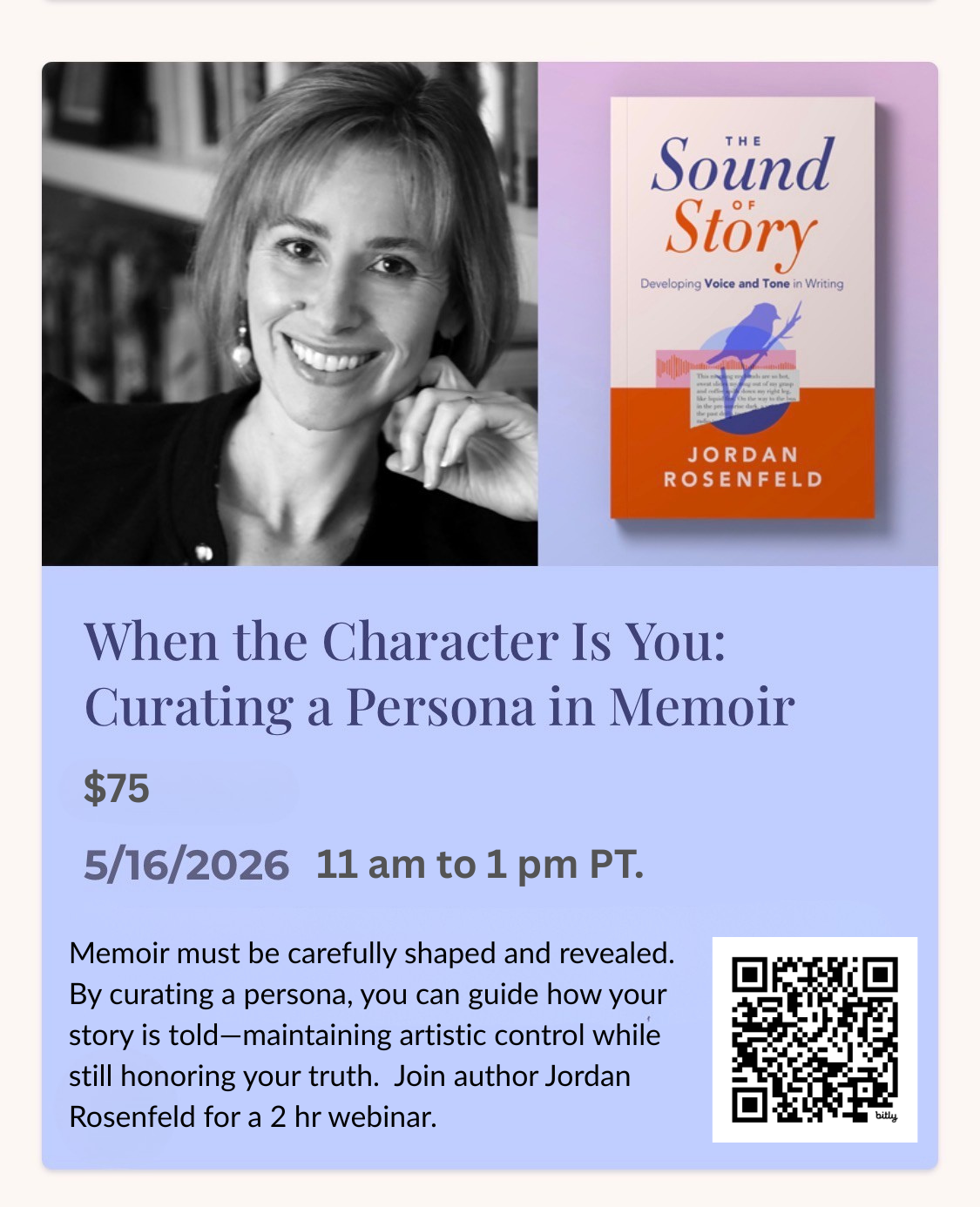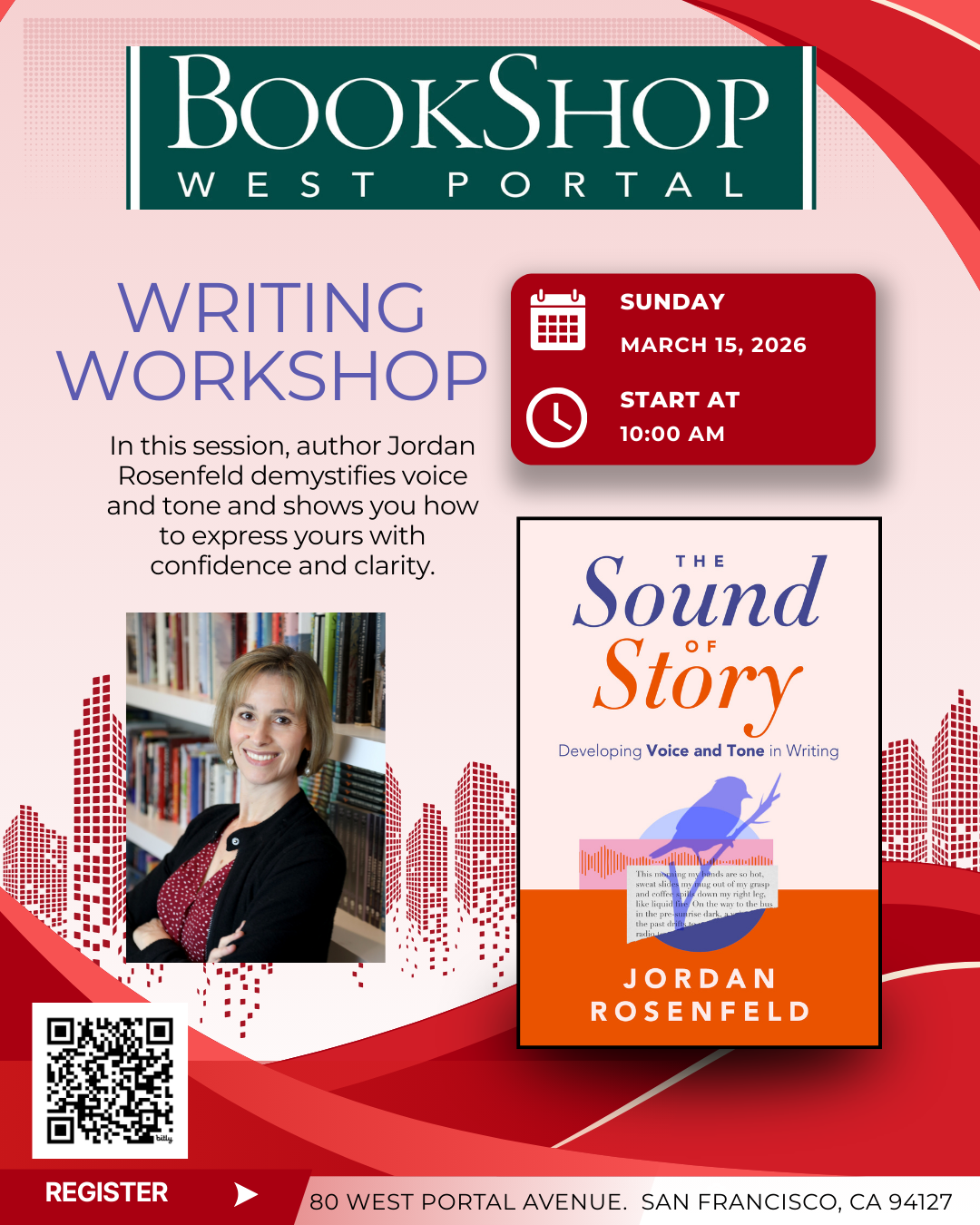 This class will be at 10am on Sunday, March 15th, in Bookshop West Portal, and will last an hour and 15 minutes. Included with your registration cost is a copy of Jordan's book, The Sound of Story.